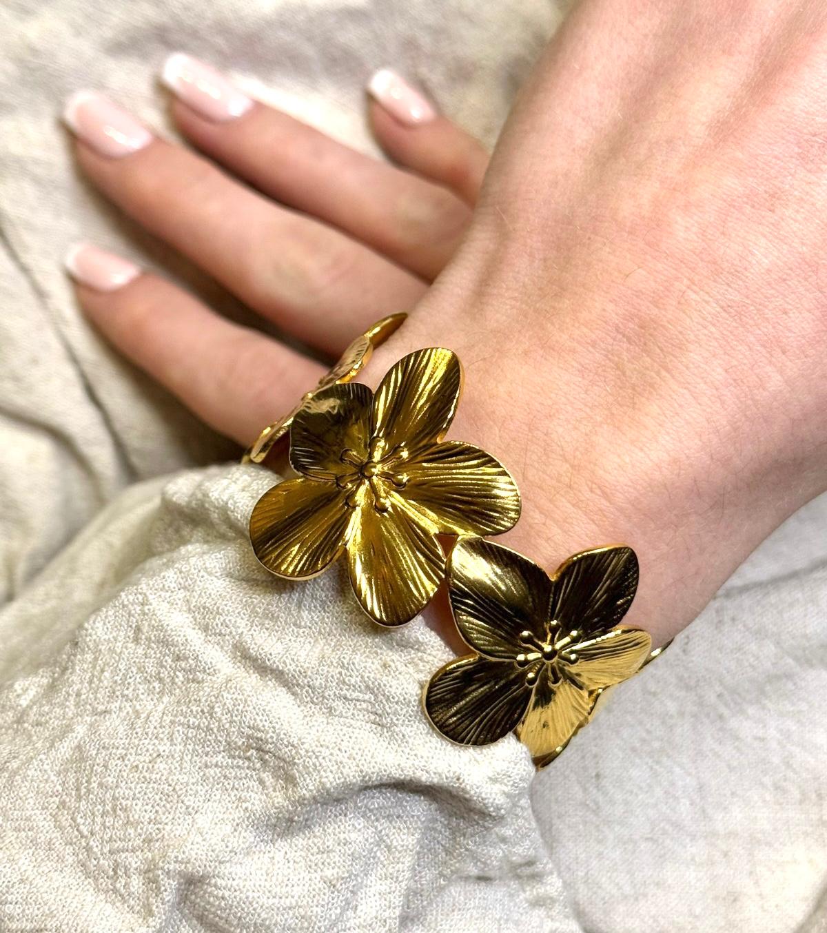 Bracelet en acier inoxydable doré orné de fleurs délicates et texturées. Un bijou élégant, parfait pour sublimer votre poignet avec une touche florale raffinée.