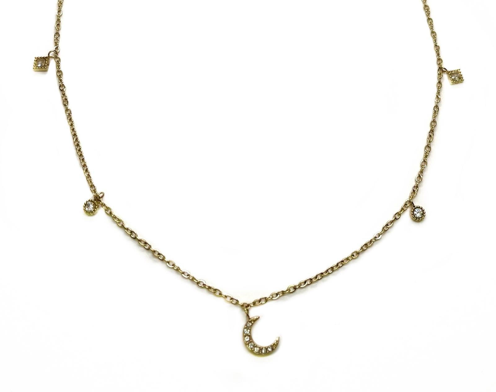 Collier fin en acier inoxydable avec pendentif lune et petits charms brillants. Résistant, hypoallergénique, parfait pour un style élégant au quotidien.